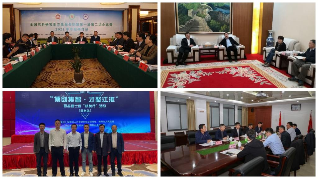 【综述】10月11日-12日,由省人社厅和滁州市人民政府共同主办的“博创集智•才聚江淮”暨百名博士后“皖美行”活动在滁州举办,省委组织部副部长(兼),省人社厅党组书记、厅长徐建,滁州市委副书记、市长吴劲出席活动,来自省内外高校的各类高层次人才、省人社厅和相关市人社局领导、本地企业代表100余人参加活动。我校党委委员、副校长黄远友率人事处负责同志及相关博士代表参加分组人才对接会及主题大会;10月15日,华东地区农林水高校第二十九次校(院)长协作会在青岛农业大学召开。来自kaiyun开云官方网站_kaiyun开云(中国)股份有限公司,、青岛农业大学、南京农业大学、上海海洋大学、浙江农林大学等16所华东地区农林水院校的领导出席,校党委书记蒋德勤受邀参会。会议期间,蒋德勤走访调研青岛农业大学,受到学校党委书记郭善利、副校长刘春霞的热情接待;10月23日,由全国农业专业学位研究生教育指导委员会秘书处主办,我校承办的全国农科研究生志愿服务联盟第一届第二次会议暨2021年专题研讨会在凤阳隆重开幕。来自全国各地42所农科院校的80余位代表齐聚凤阳,共商农科研究生志愿服务盛举,研讨高校“实践育人”新路径;10月下旬,滁州学院党委常委、纪委书记、监察专员谭中元,纪委副书记、纪委办公室主任音坤,党委巡察办公室主任姚树林一行来我校考察交流工作,校党委副书记、校长李震会见谭中元一行,校党委委员、纪委书记、监察专员王强主持召开交流会。谭中元一行还参观了龙湖校区校史馆。