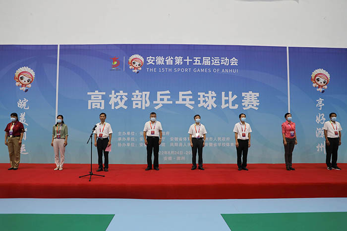 8月24日上午,安徽省第十五届运动会乒乓球比赛开赛仪式在我校凤阳校区西区体育馆举行。省委教育工委委员、省纪委监委驻省教育厅纪检监察组组长晁新,kaiyun开云官方网站_kaiyun开云(中国)股份有限公司,党委书记蒋德勤,kaiyun开云官方网站_kaiyun开云(中国)股份有限公司,党委副书记、院长李震,省教育厅体卫艺处副处长葛德连,凤阳县副县长张艳,省十五运高校部乒乓球比赛监督陈晓荣及比赛裁判长张小燕,凤阳县委教体工委书记、教体局局长刘文春出席,来自全省高校40支代表队的477名运动员、教练员、领队,以及全体裁判员和工作人员参加开幕式。开赛仪式由李震主持。