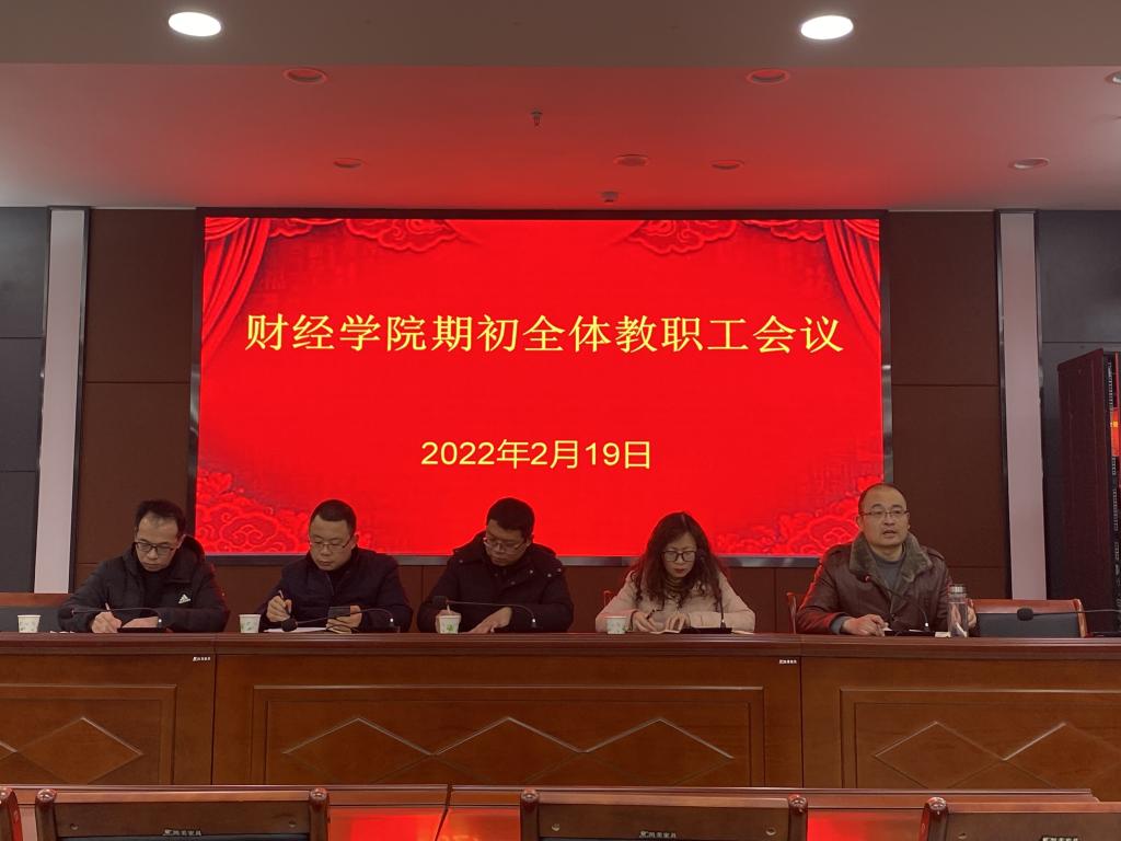 2月19日下午,财经学院在西辅楼111会议室召开新学期全体教职工大会,学院党委书记杜小明,党委副书记、院长郝世绵,党委副书记、纪委书记耿广汉,副院长李强、李宝礼及全体教职工参加了会议。会议由郝世绵主持。
