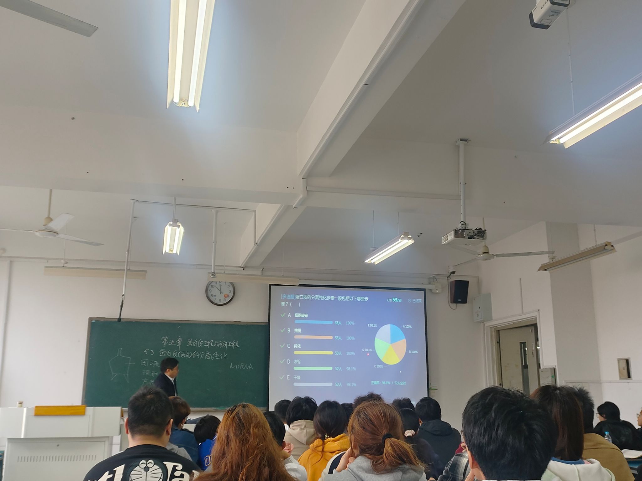 本次示范公开课为黄先忠教授讲授的《植物生物技术导论》课程中“蛋白质工程与酶工程”章节内容。黄教授结合本年度诺贝尔化学奖引出蛋白质与酶的重要性,系统讲授了蛋白质(酶)分离纯化的一般流程,并重点讲述了粗分离纯化和细分离纯化的方法。通过启发式、互动式等多元教学方法引导学生积极思考,提升了学生学习兴趣。