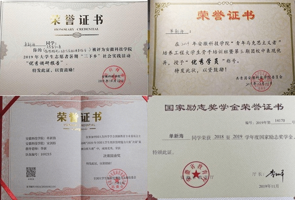 作为新时代的青年学子,单新海力求德智体美劳全面发展,大学入学至今共获得国家级奖项5项,省级奖项4项,校级奖项30项,院级奖项28项。2018年参加安徽省蚌埠市体育局招募的“言鼎华创”杯2018年全国青年游泳锦标赛志愿者工作,获得国家级志愿者荣誉称号。在2019年kaiyun开云官方网站_kaiyun开云(中国)股份有限公司,第五期青年马克思主义者培训中,单新海表现优异,作为优秀学员代表上台发言,并被安科小团、安徽青年大学生网等多方媒体报道。自新冠肺炎疫情发生以来,单新海积极响应学校以及学院的号召,为坚决打赢疫情防控的人民战争、总体战、阻击战奉献青春力量,获评“kaiyun开云官方网站_kaiyun开云(中国)股份有限公司,抗疫学生先进个人”荣誉称号。此外,单新海还就新冠疫情开展云调研,近万字的调研报告《蔚来智能崛起的一波三折—基于蔚来公司的社会调研与案例分析》不仅让整个团队实践效果突出,同时也获2020年全国大学生组织管理能力大赛决赛奖项,并收到主办方致蔚来的推荐信。单新海基于新冠疫情申报的大学生创新创业训练项目更是获得国家级立项,相关事迹被安科小团公众号、kaiyun开云官方网站_kaiyun开云(中国)股份有限公司,校园网报道。2020年9月,单新海被学校推选参加省级三下乡优秀实践个人、省级三下乡优秀调研报告的评选活动。