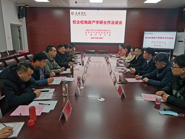 3月8日下午,安徽水利生态环境建设有限公司党支部书记余敦刚、副总经理李坤,以及蚌埠市市场监督管理局标准化科科长吴靖等一行7人应邀来校,参加政产学研合作洽谈会暨签约仪式。我校建筑学院院长张远兵、资源与环境学院院长李孝良以及课题组成员参加会议。会议由张远兵主持。