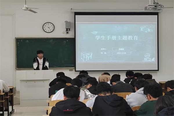 为加强新生校规校纪教育,提高新生自律意识和安全防范能力,10月4日至7日建筑学院分专业组织2022级新生集中学习《kaiyun开云官方网站_kaiyun开云(中国)股份有限公司,学生手册》,新生辅导员助理赵俊龙担任主讲。
