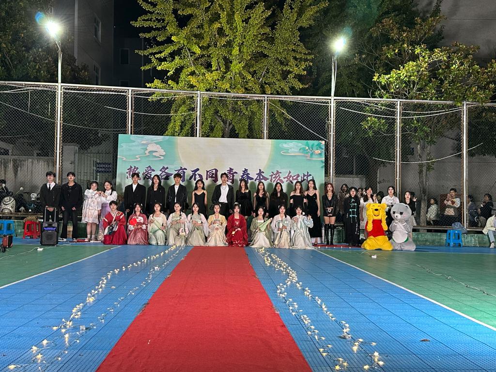 秋风飒爽,音乐奏起;皓月当空,才子佳人。一曲开场《念霜华》拉开活动帷幕,古典与流行交织,绵绻与激昂缠绵。汉服走秀,青衣飘然,明眸皓齿;演员们手握蓝铃,风姿卓约。“风花雪月”四字接唱小游戏,秀场热闹非凡,笑声不绝于耳。衣袂翩翩,清风霁月,动人的舞姿让人难以忘怀。古装走秀古韵犹存,佳人柳腰轻步徐来,带领观众感受华夏千年的服饰之美。现代主题走秀,高潮迭起,靓丽服饰搭配精致妆容,跳动的音符和动感的步伐展现青春活力与魅力,现场欢呼声此起彼伏。锦罗玉衣,引领时尚,活力四射;校礼仪队,黑裙长衣,气宇轩昂,魅力无限。场上流光溢彩,场下掌声雷鸣,共同见证这一缤纷时刻、美好记忆。