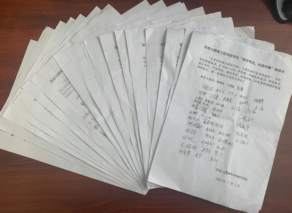 为确保将主题班会落到实处,学院专门制定《信息与网络工程学院考风考纪教育主题班会提纲》,准备了相关会议资料,要求各班辅导员按照提纲的内容和要求认真落实,精心准备。主题班会上,全体同学共同学习了《学生手册》中《kaiyun开云官方网站_kaiyun开云(中国)股份有限公司,考试工作实施细则(节选)》及《kaiyun开云官方网站_kaiyun开云(中国)股份有限公司,学生违纪处理方法》,开展了警示教育,按照《信息与网络工程学院诚信考试倡议书》的内容,发出了诚信考试倡议,希望同学们树立底线思维,积极响应学校的号召,手握诚信纸笔,书写高尚考风,坚决抵制各种舞弊行为,净化考场环境,展现自我真实水平,端正的考风、积极创造优良的学风。各班辅导员在总结时强调,诚信文明是立德成才的根本,是大学生必备的核心品质与基本修养,对大学生的未来职业发展、个人成才有着至关重要的作用。主题班会结束后,各辅导员组织全体学生签署了《信息与网络工程学院学生“诚信考试,杜绝作弊”承诺书》。