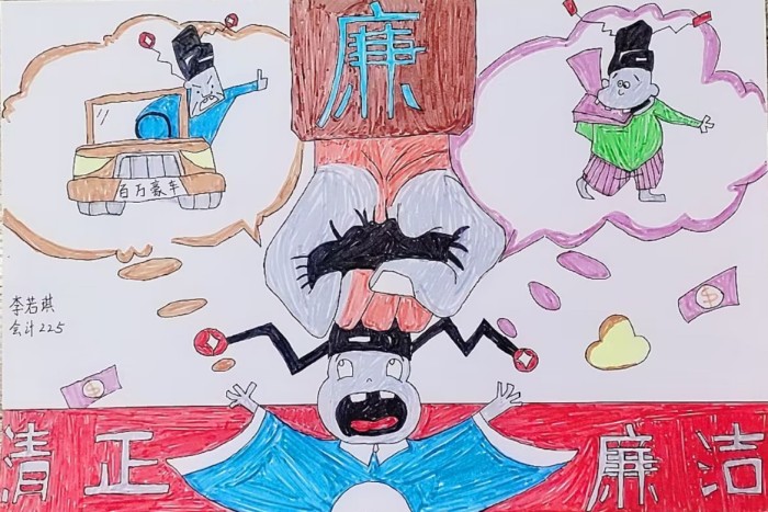 学院征集到多幅原创作品,经过投票评选,最终选出张益菲同学的《爱“廉”说》、林美霞同学的《心至廉,路致远》、李晨睿同学的《行如青竹心同莲》、李若琪同学的《廉政清明,铁“拳”无私》作为此次征集活动的优秀作品。通过此次主题画作征集活动,加深学习了习近平新时代中国特色社会主义思想、习近平法治思想和党风廉政建设的重要论述,突出学习宣传了宪法,加强民法典宣传,新颁布的法律法规宣传,学习宣传了党内重要法规。