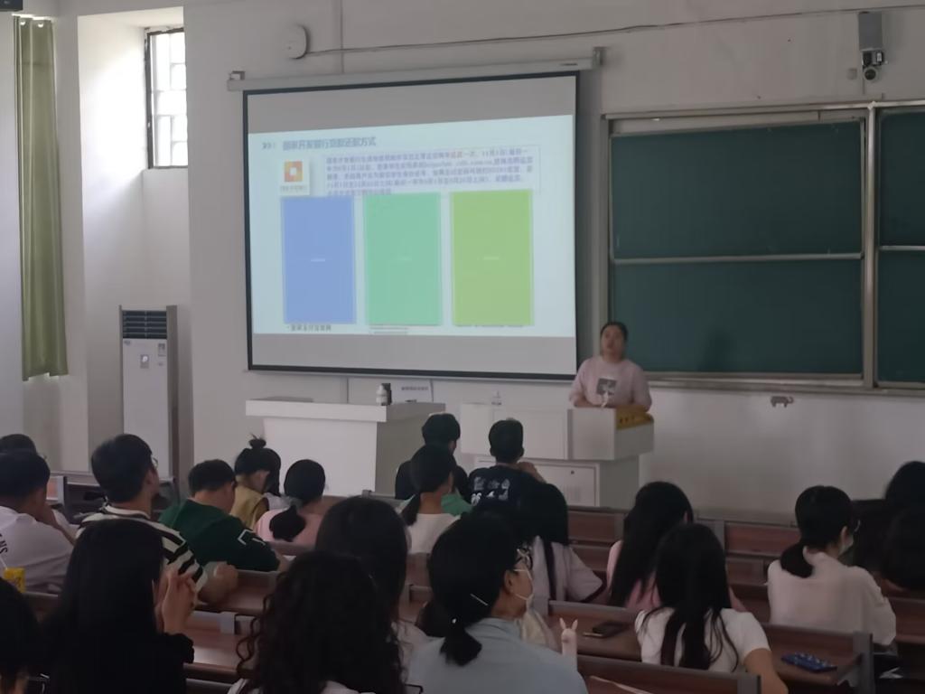 宣晶晶分别介绍了国家开发银行和农村信用合作社助学贷款的毕业还款确认流程,督促同学们诚信还款,维护好个人征信,让更多的家庭困难的学生享受到国家的资助政策。宣晶晶激励受助同学奋发图强,突破自我,奋斗出属于自己的青春,回馈国家。