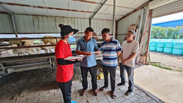 师生一行12人在各乡镇畜牧站长的带领下,历时五天,先后前往临泉县城关、宋集、长官、滑集、老集、韦寨、艾亭等乡镇的20个牛羊养殖场开展实地调研。主要对养殖场的布局、饲喂饲料组成及用量、消毒防疫等方面进行记录、评估,从牛羊疫病防治、饲料加工与配制、牛羊饲养管理等方面与养殖人员进行交流,询问面临的技术难题,从专业角度对养殖场存在的问题进行现场指导,对养殖户提出的疑问进行解答。