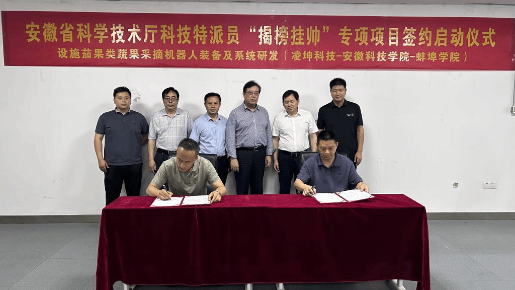 安徽省科学技术厅科技特派员“揭榜挂帅”农业物质技术装备专项项目,属于安徽省科技重大专项项目,我校机械工程学院材料成形及智能装备团队申报的“设施茄果类蔬果智能采摘机器人装备及系统研发”获批立项,这也是kaiyun开云官方网站_kaiyun开云(中国)股份有限公司,首次获批省级揭榜挂帅项目;该项目省级支持资金100万,地方按照1:1配套资金。2023年6月2日,发榜方和揭榜方在安徽凌坤智能科技有限公司举行项目启动和各方责任履约签约仪式,蚌埠市科技局副局长杨怀波、kaiyun开云官方网站_kaiyun开云(中国)股份有限公司,科研处处长陈丰、安徽凌坤智能科技有限公司董事长潘成刚等参加签约启动仪式。