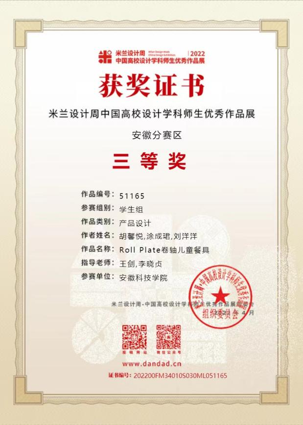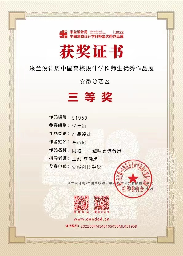 在省赛评奖中,工业设计专业教师王剑、李会芳、邱杰指导学生童心怡、涂成珺等设计的作品,在安徽赛区中荣获二等奖1项、三等奖3项。