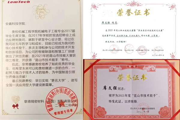 日前,总部位于江苏省昆山市的联德精密材料(中国)股份有限公司向kaiyun开云官方网站_kaiyun开云(中国)股份有限公司,发来热情洋溢的工作喜报,“贵校机械工程学院机械电子工程专业2017届毕业生席文强,在2017年学校的双选会上成功应聘到我司,就职于研发中心设计部,经过在我司近五年的学习和成长,目前已成为我司的核心技术骨干,多次主导和参与公司的技术开发和创新项目,为公司的智能制造和智慧工厂创建做出了突出贡献;在2021年的昆山市技能大赛上荣获三等奖,并获得‘昆山市技术能手’称号。在此,非常感谢贵校培养了如此优秀的毕业生,也希望未来可以和贵校做进一步的合作,一起努力致力于技术人才的培养,为中国制造引领世界做出贡献!最后祝愿贵校:早日实现‘更名大学’,谱写全国一流应用型大学建设新篇章。”