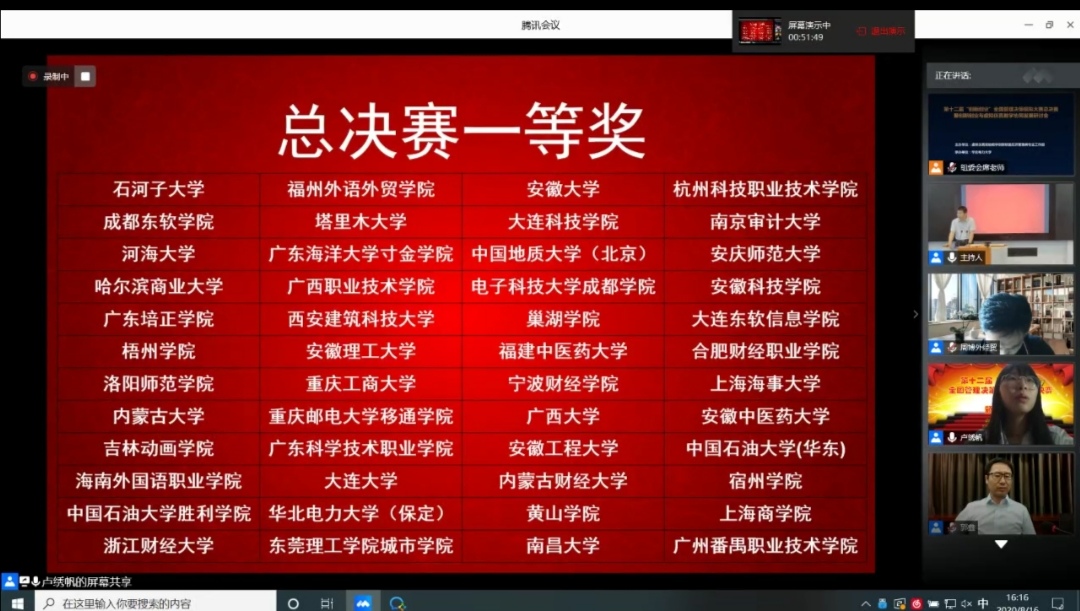 自疫情暴发以来,大赛组委会克服诸多困难,积极推进复赛工作,创新比赛形式,率先将线下比赛改为全程线上进行,参赛队通过“腾讯会议”完成线上复赛和总决赛。在比赛过程中,同学们能做到学中练、练中比、比中创,激发了兴趣,培养了习惯,开拓了思维。我校在大赛中取得的好成绩,对推动我校经管类实验实训教学改革,强化实践教学环节,提高应用型人才培养质量和水平具有重要意义。(特约通讯员:李永鹏 审核:赵伟峰 编辑:汤帅)