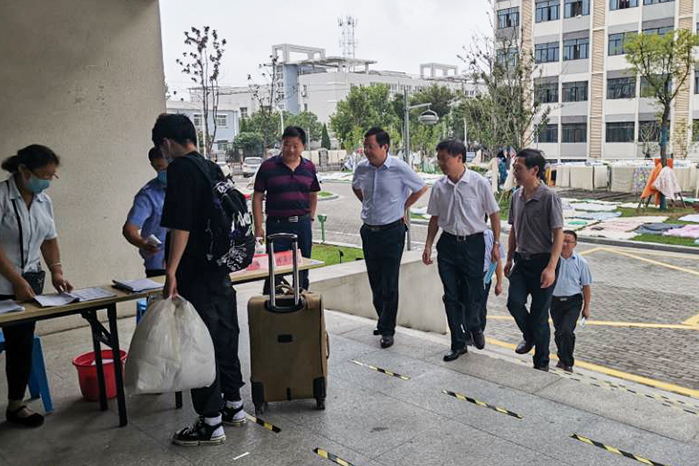 学生返校牵动着校领导的心,上午9时许,校党委书记蒋德勤,党委副书记、校长李震,党委委员、副校长黄远友在有关部门负责同志陪同下全面检查学生返校工作。在各学院学生报到点,校领导详细了解第一批学生返校及防疫物资准备情况,要求各学院本着安全第一的原则精心为返校学生做好服务工作。在学生食堂,校领导认真检查消毒清洁工作,详细了解菜品供应和学生错峰就餐安排情况;在学生宿舍,校领导与刚返校的学生亲切交谈,关切的询问同学们在家期间学习生活情况,热烈欢迎同学们安全返校。校领导对返校报到各项工作表示肯定,要求各部门、各学院继续高度重视疫情防控工作和学生返校工作,及时发现问题,迅速整改落实;关注学生思想动态,做好各类学生的跟踪管理服务;认真思考谋划,统筹做好疫情防控和教育教学工作,确保学生生命安全和身心健康。