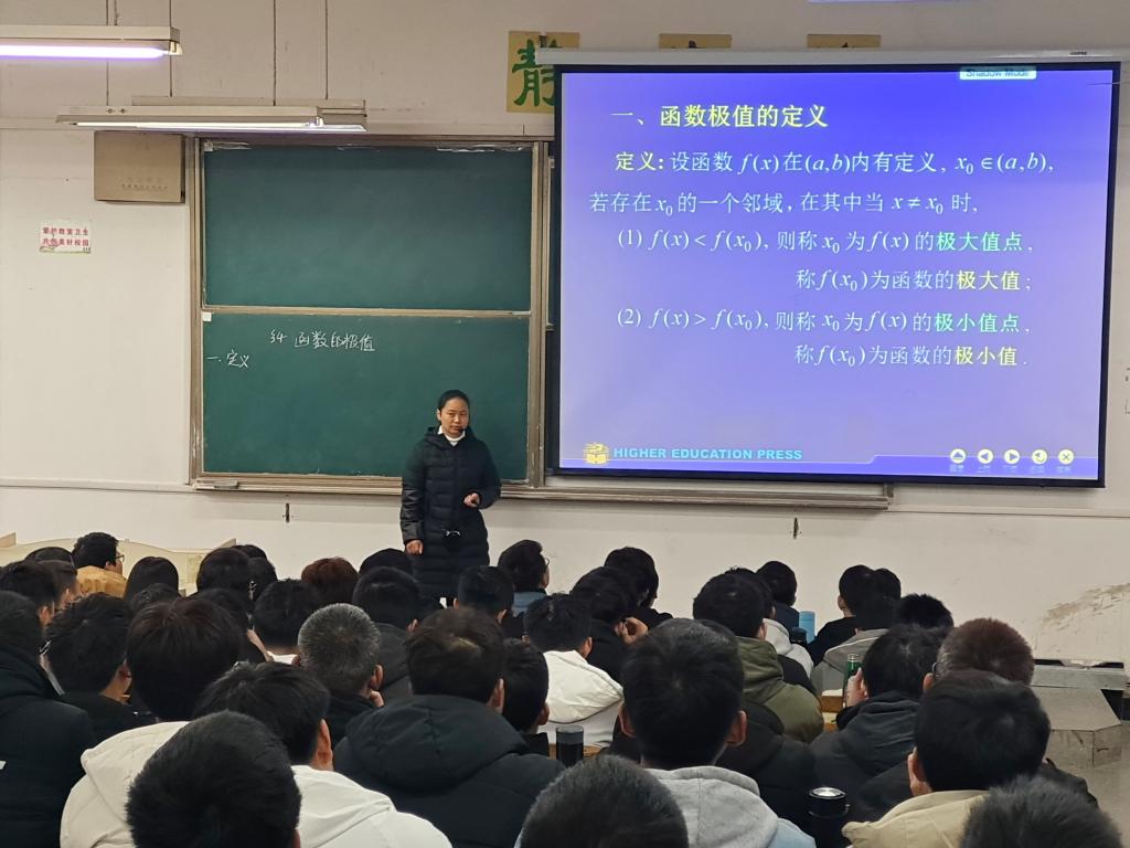 郭竹梅老师本次课堂教学的主要内容为《高等数学A》课程中的“函数的极值”。示范课上,郭老师通过宋代诗人苏轼的《题西林壁》一诗,巧妙引出函数极值的定义,并通过“极大值一定大于极小值吗”的问题设置,逐层分析推导出“极值的必要条件”和“极值的充分条件”,还及时结合例题,进行了深入浅出的讲解,帮助学生巩固了所学知识。郭老师专业知识丰富,教学功底扎实,思维敏捷,讲解清晰,教学过程层次分明;授课中善于运用启发式教学,在恰当的时间点上抛出问题,引导学生积极主动思考;积极发挥信息技术手段在课堂教学中的作用,增强学生在教学过程中的参与度,帮助学生养成自主学习的良好习惯。在讲解“函数的极值”时,郭老师引导并启发同学们认识到,人的一生会遇到各种顺境和逆境(极大值与极小值),但只要胜不骄败不馁,就一定会取得人生的一个又一个成功。