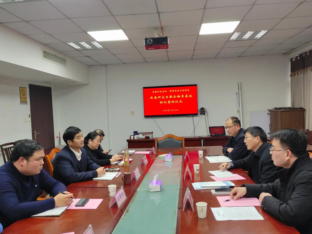 为进一步深化产教融合专业学位研究生培养模式改革,根据国家和安徽省有关文件精神,本着“资源共享,优势互补,相互协作,互利共赢”的原则,12月13日下午,研究生处处长张春雨,管理学院党委书记丁景良、院长赵伟峰等一行赴蚌埠市农业农村局洽谈共建研究生联合培养基地事宜,受到农业农村局局长李勇、副局长王书华、孙明恒等的热情接待。