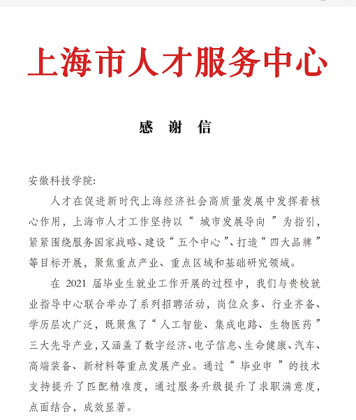 鉴于在毕业生就业、人才服务、线上与线下双向互动,以及信息共享等方面卓有成效的合作,上海市人才服务中心专门向我校发来感谢信。感谢我校统筹疫情防控和就业服务,通过理念提升、科学布局、主动作为,取得了人才与就业工作的双赢,为就业大局稳定和上海人才合作做出的积极贡献。