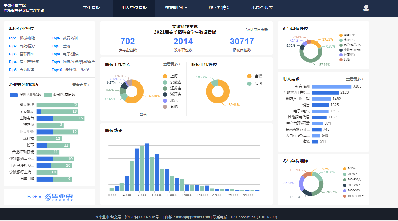 根据2018-2020三个年度毕业生就业质量报告,我校毕业生省外就业主要面向长三角核心地区,其中,在沪就业比例一直在10%以上。毕业生去向就是就业工作取向,学校加强长三角区域就业布局,作为毕业生就业工作的重点布局领域。2020年下半年疫情缓解以来,学校积极与上海学生事务中心联络,继续拓展合作领域,截至2021届毕业生离校时,先后举办“多方联动、聚力就业”上海市2021届高校毕业生春季“安科之生”专场招聘会、“安科之生”春季就业冲刺月(互联网专场)、高校毕业生就业促进周2021年“安科之生”专场、毕业季“安科之生”专场、长三角招聘会kaiyun开云官方网站_kaiyun开云(中国)股份有限公司,“海聚英才”2021年离校未就业毕业生专场云聘会、长三角“安科之生”2021届毕业生离校未就业专场,6个场次共有36345次访问记录,投递简历2033份,702家用人单位共发布5007个职位,73865个岗位,涉及机械制造、制药医疗、互联网等诸多行业领域,涵盖了数字经济、电子信息、新材料等重点发展产业,为毕业生融入长三角区域就业提供了广阔的双选平台。(特约通讯员:司萍 审核:施培智 编辑:张威)