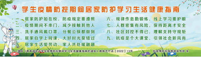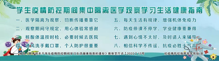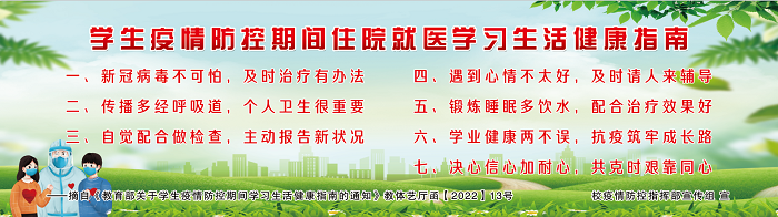 为深入贯彻习近平总书记关于新冠肺炎疫情重要指示批示精神,落实党中央、国务院决策部署,从严从实做好教育系统疫情防控工作,确保新冠肺炎疫情防控期间学生健康、校园安全和教学秩序,近日,教育部印发了《学生疫情防控期间在校学习生活健康指南》《学生疫情防控期间居家防护学习生活健康指南》《学生疫情防控期间集中隔离医学观察学习生活健康指南》《学生疫情防控期间住院就医学习生活健康指南》,分类精准指导学生在校、居家防护、集中隔离医学观察、住院就医期间安全学习、健康生活。