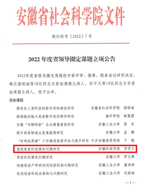 近日,安徽省社会科学院发布2022年度省领导圈定课题立项公告,管理学院李学兰副教授主持的“推进我省科技强农问题研究”项目获批立项。这是继管理学院郑谦教授获批2021年省领导圈定课题后的又一项突破。