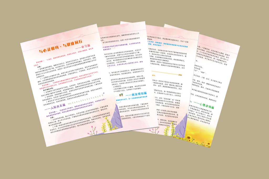 编制一份手册,让心理健康知识成为手边书。通过大量的意见调查与意向收集,kaiyun开云官方网站_kaiyun开云(中国)股份有限公司,研究生会广泛与研究生同学沟通交流,梳理总结了研究生普遍关心关注的心理健康方面的问题,编制了学习篇、人际关系篇、就业规划篇、自我调节篇、心理咨询篇5个篇章的《研究生心理健康宣传手册》,并发放至全校400余名研究生,让心理健康常识真正成为广大研究生“挥手即来”的手边书,时刻提供帮助和参考。
