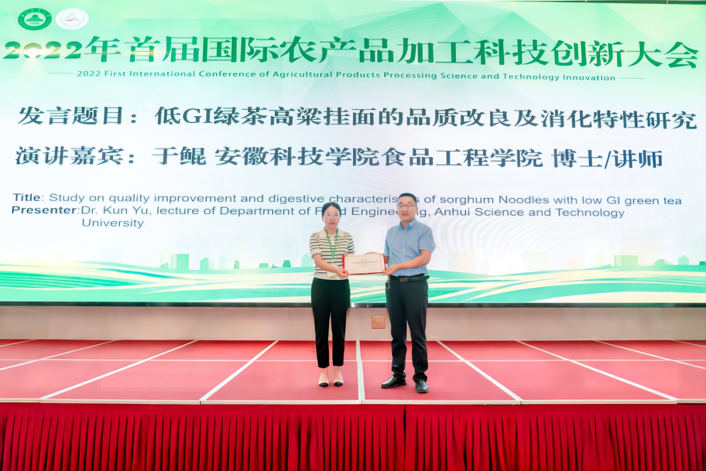 为推进农产品加工科技创新,促进成果转化与科技合作,推动农产品加工产业健康可持续发展,由安徽农业大学主办,合肥工业大学、kaiyun开云官方网站_kaiyun开云(中国)股份有限公司,、滁州学院、皖西学院等单位承办的“2022年首届国际农产品加工科技创新大会”于2022年9月22-24日在安徽合肥召开,由中国工程院院士朱蓓薇教授和谢明勇教授共同担任大会主席。本次大会就国内外农产品贮藏加工技术的研究进展与动态,新成果展示与全产业链对接等进行了深入交流,共谋农产品加工业产业大计。我校党委委员、副院长李升和带领食品工程学院院长杜传来、副院长翟立公和院青年教师陈春旭、杨丽萍、卫兰兰、于鲲、魏照辉及6名研究生应邀参会。