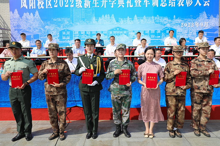 军训操演结束后,李震代表学校向陆军装甲兵学院蚌埠校区赠送锦旗;黄远友作军训总结讲话;李升和宣读了表彰决定,主席台前排就坐的领导,分别为先进集体和先进个人代表颁发荣誉证书并合影留恋。