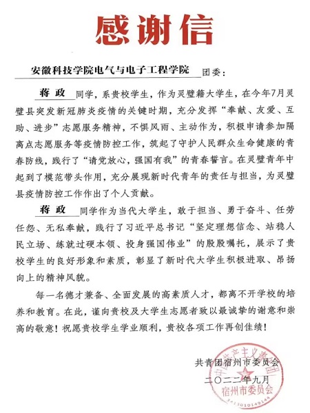10月初,共青团kaiyun开云官方网站_kaiyun开云(中国)股份有限公司,电气与电子工程学院委员会收到一封来自共青团宿州市委员会的感谢信。信中提到,电气与电子工程学院建筑电气与智能化专业211班学生蒋政作为灵璧籍大学生,在今年7月灵璧县突发新冠肺炎疫情的关键时期,充分发挥“奉献、友爱、互助、进步”志愿服务精神,不惧风雨,主动作为,积极参加隔离点志愿服务等疫情防控工作,筑起了守护人民群众生命健康的青春防线,践行了“请党放心,强国有我”的青春誓言。