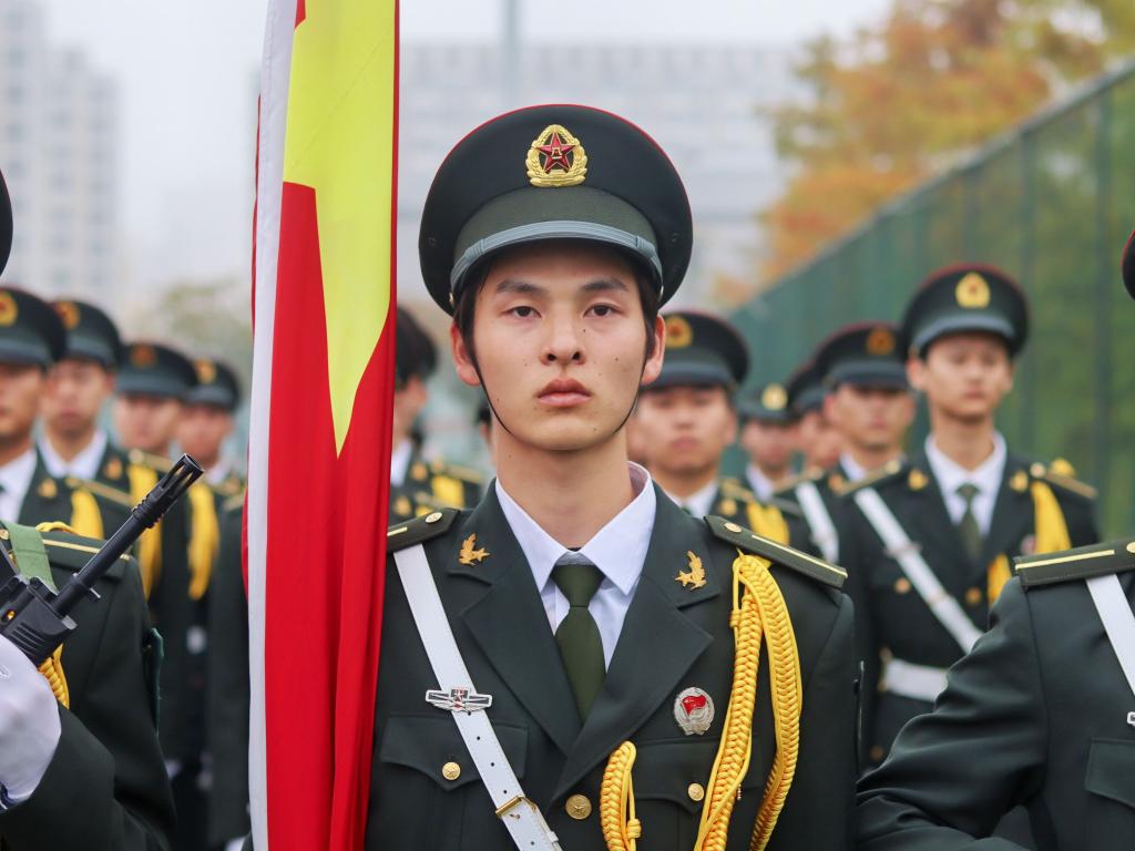 迎着初冬的清凉,校旗队缓缓入场,坚定的眼神,有力的步伐,显示升旗仪式的庄严与肃穆。