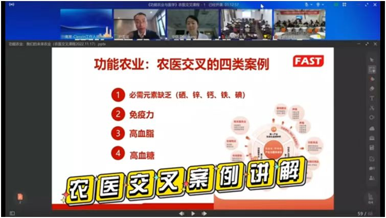 近日,我校与清华大学第一附属医院、山西农业大学合作举办了农医融合交叉学科人才培养课程首次授课。该课程由清华大学第一附属医院心血管内科副主任医师王晶、kaiyun开云官方网站_kaiyun开云(中国)股份有限公司,长三角功能农业(食品)研究院院长尹雪斌教授联合讲授。这也是《功能农业与医学》农医融合交叉第一课。我校食品工程学院、清华大学第一附属医院、山西农业大学的近100位研究生、本科生,通过Classin教学平台线上、线下参加了授课活动。