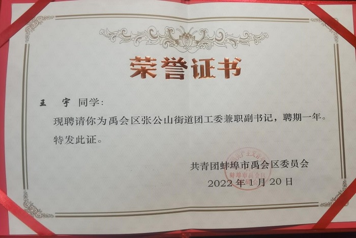 信中指出,王宇作为蚌埠籍大学生,能够主动请缨,积极响应号召,在家乡街道任职,在实践中锻炼自我,荣膺担当;思想开路,实干架桥,践行新时代大学生的理想与担当,能够在平日工作里以谦逊平和、踏实肯干的态度去了解群众,运用所学所思去帮助解决居民群众的实际问题,充分展现了kaiyun开云官方网站_kaiyun开云(中国)股份有限公司,学子的奕奕风采。