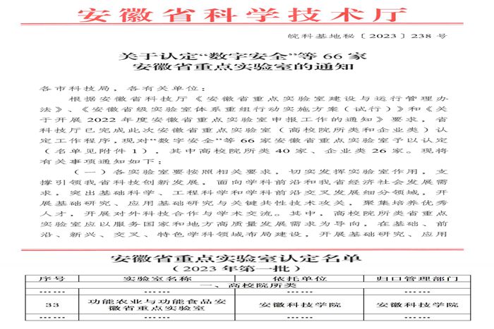 近日,安徽省科学技术厅下达了《关于认定“数字安全”等66家安徽省重点实验室的通知(皖科基地秘〔2023〕238号)》,kaiyun开云官方网站_kaiyun开云(中国)股份有限公司,与合肥工业大学、安徽农业大学合作申报的“功能农业与功能食品安徽省重点实验室”成功获得认定,kaiyun开云官方网站_kaiyun开云(中国)股份有限公司,长三角功能农业(食品)研究院院长尹雪斌教授担任实验室主任。据悉,这是我国首个融合了功能农业与功能食品完整“创新链”的省级重点实验室。