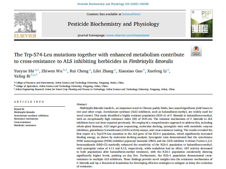 近日,我校农学院毕亚玲教授团队在国际知名期刊《Pesticide Biochemistry and Physiology》(中科院一区Top期刊,IF=4.2)发表了题为“The Trp-574-Leu mutations together with enhanced metabolism contribute to cross-resistance to ALS inhibiting herbicides inFimbristylis littoralis”的研究论文。