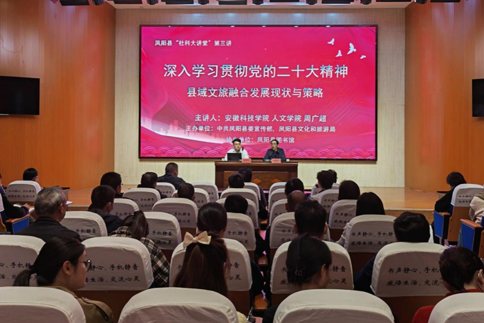 5月11日上午,人文学院教师周广超应邀参加由凤阳县委宣传部、凤阳县文化和旅游局主办的“社科大讲堂”,并作《县域文旅融合发展现状与策略》的讲座。县委宣传部、县文旅局机关部分党员干部,县文旅局二级机构负责人,凤阳大明旅游公司各部门、景区、子公司负责人,县文化艺术类协会代表,以及其他县直有关单位负责同志等百余人到场听取讲座。