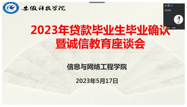 为增强贷款毕业生的诚信还款意识,加强毕业生诚信教育和文明教育,5月17日晚上,信息与网络工程学院通过腾讯会议召开2023届贷款毕业生毕业确认暨诚信教育座谈会,会议由学院资助工作联系人丁阿敏主持,2023届贷款毕业生参加会议。