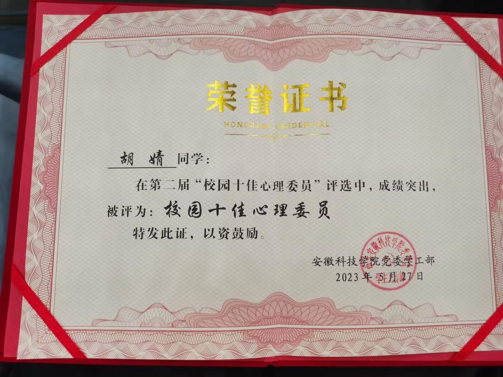 为鼓励表彰优秀心理委员,传播积极的班级心理健康教育工作理念,5月27日下午校园“十佳心理委员”评选活动在凤阳校区图书馆二楼报告厅举行。建筑学院风景园林201班心理委员胡婧同学荣获校园“十佳心理委员”荣誉称号。