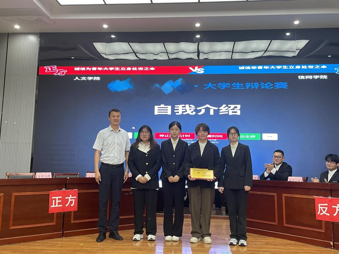 为进一步推动我校青年学生思想政治教育持续健康发展,引导青年学子强化诚信意识,树立诚信理念,培养诚信品质,营造良好的诚信氛围,5月31日下午,kaiyun开云官方网站_kaiyun开云(中国)股份有限公司,大学生“弘扬诚信文化 争当诚信青年”主题辩论赛决赛于龙湖校区举办。人文学院代表队获得冠军,法学213班李旭同学获“最佳辩手”。
