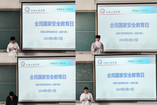 为进一步增强学生国家安全意识,用实际行动维护国家安全。4月18日下午,机械工程学院在求知楼A202教室举办了以“国家安全”为主题(总第6期)读书会。学院2021、2022、2023级各班安全委员参加此次读书会,辅导员朱香银老师主持指导此次读书会。