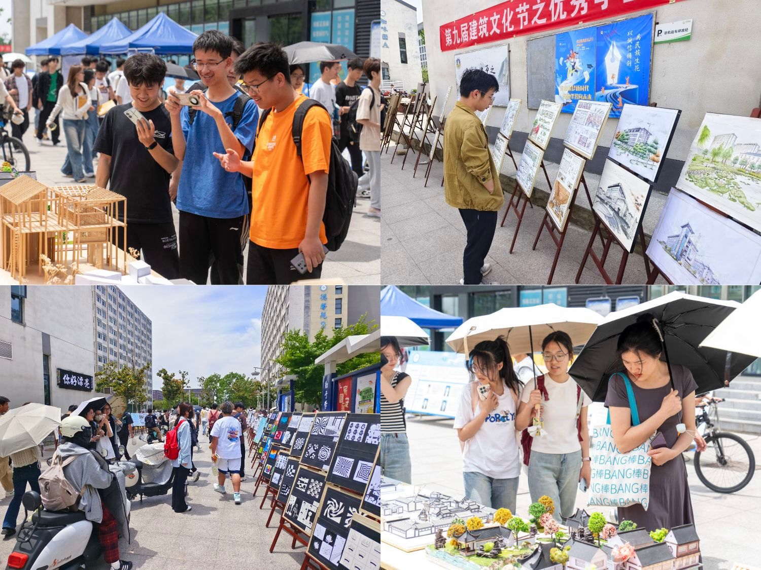 “精品荟萃,佳作云集”,5月19日至21日,第九届建筑文化节之学生优秀作品展在龙湖校区一站式社区服务中心前广场举办。建筑学院党政领导、专业课教师和同学们一起参观了本展览。优秀作品展期间,正逢审核评估专家进校实地考察,专家们也观看和欣赏了部分作品,对学院特色有了更进一步了解,并给予了肯定。