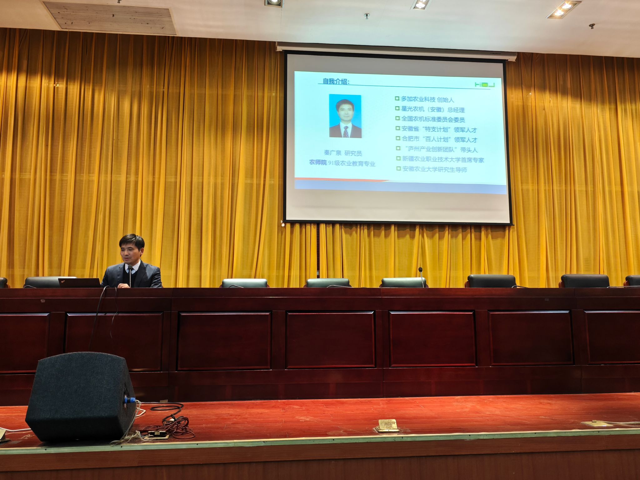 秦广泉讲述了当前全国大学生的就业形势,介绍了当代智慧农业对大学生就业创业带来的机遇和挑战,回忆了自己的创业经历。秦广泉在农业技术推广中善于学习,勇于探索和钻研农业信息技术,发现和找到国外农药使用的新技术,发达国家农作物产量逐年提高,农药使用不断减少的关键科学技术。决定自筹经费从植保机械的研发入手,组建团队,设计方案。经多年实践和技术创新,研制出用药少,产量高的多种植保智能机械,深受农业科技和推广部门的重视,其智慧农业覆盖安徽、新疆、甘肃、海南等地,先后承担省市重点研发项目,创制先进的农机装备60余种,多次在国家、省机器人创新创业大赛中获奖,被农业科研部门破格聘为研究员,获安徽省智慧农业创新领先人才等荣誉。