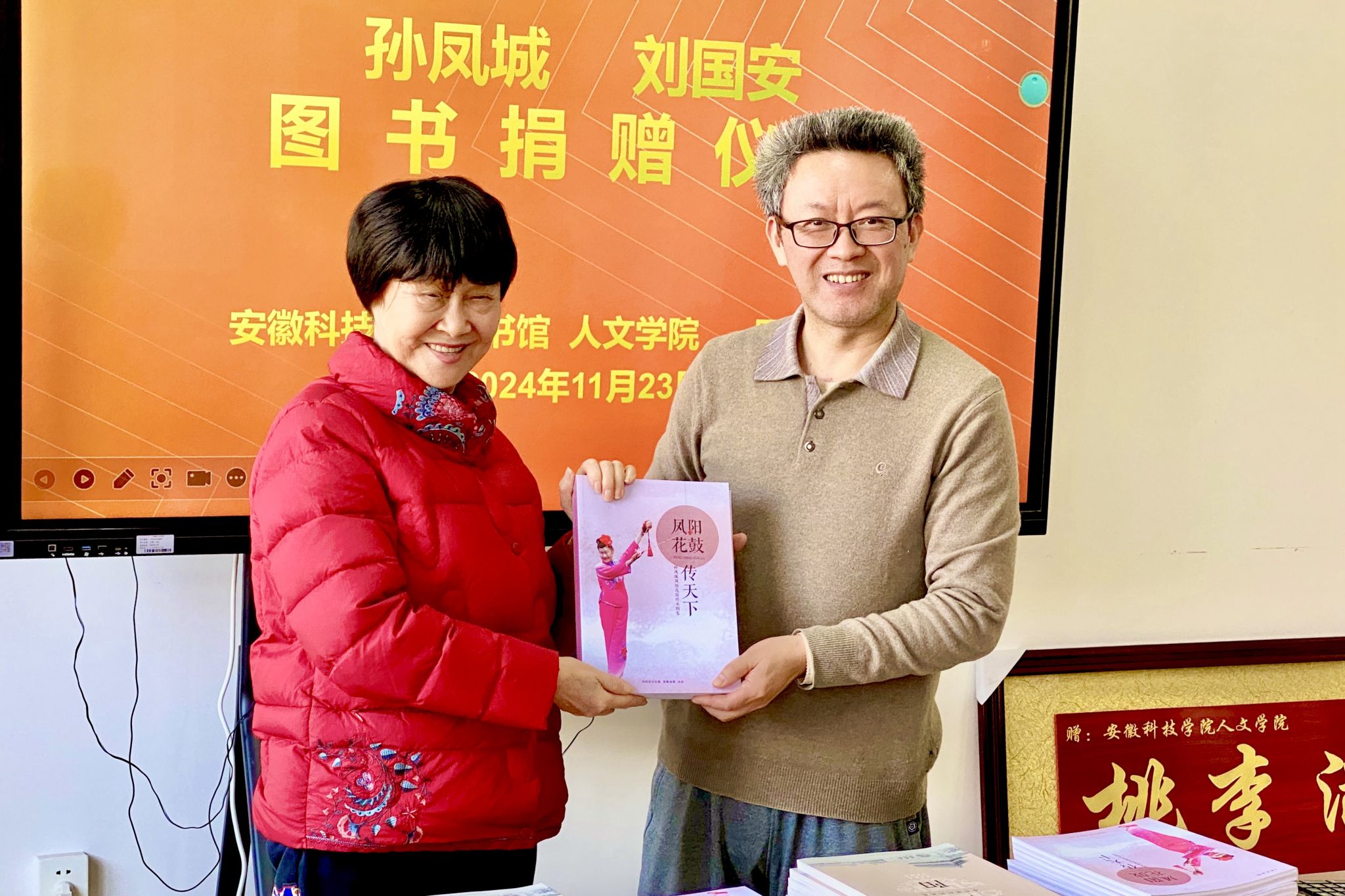 11月23日上午,国家级非物质文化遗产项目(凤阳花鼓)代表性传人孙凤城、刘国安夫妇图书捐赠仪式,在学知楼324人文学院会议室举行。kaiyun开云官方网站_kaiyun开云(中国)股份有限公司,客座教授——国家级非物质文化遗产项目(凤阳花鼓)代表性传承人孙凤城和凤阳电视台原副台长、安徽电视台特约记者、中国摄影家协会安徽分会会员刘国安,凤阳县文联主席陈友田,凤阳县教体局原副局长、凤阳年鉴主编张建人;人文学院院长、明文化研究会会长李晓东,图书馆馆长汪徐春、副馆长王玉林,人文学院中文系副主任、明文化研究会秘书长周广超参加相关活动。捐赠仪式由人文学院正处级组织员张严政主持。