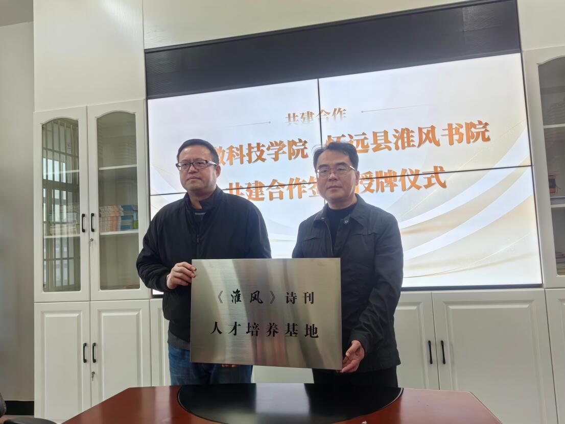 在签约暨授牌仪式上,李晓东、宫蔚国分别代表双方签署了共建实习实训基地协议,并举行“kaiyun开云官方网站_kaiyun开云(中国)股份有限公司,共建合作基地”“《淮风》诗刊人才培养基地”“ 《淮风》诗刊文学创作基地”授牌仪式。