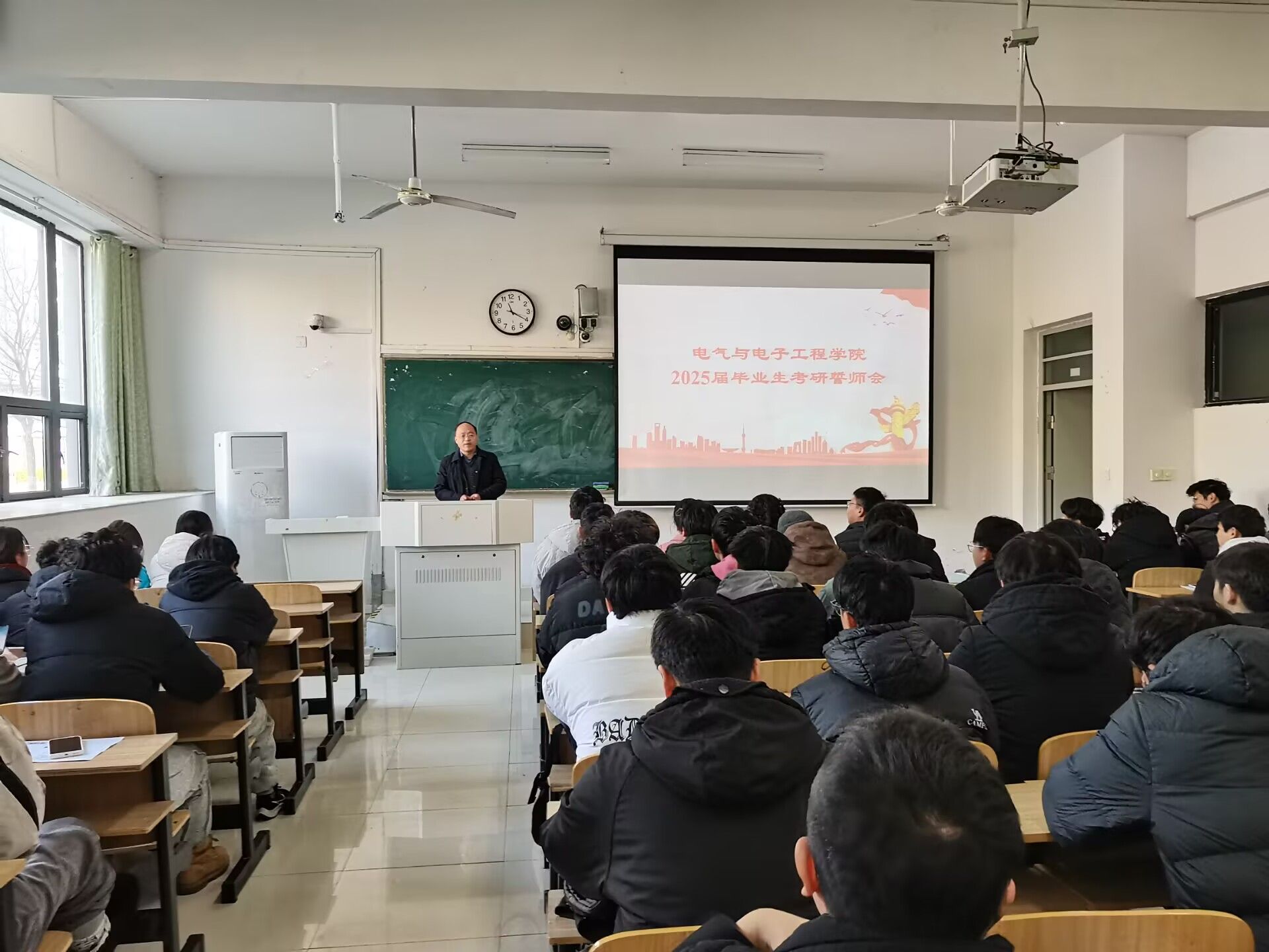 为激励即将踏上考研征途的学子们,发挥学院全过程育人实效,12月19日上午,电气与电子工程学院在致知楼C108教室举行了2025届毕业生考研誓师会。学院党委副书记、纪委书记尚磊,各毕业班辅导员,近200名考研学子参加会议。