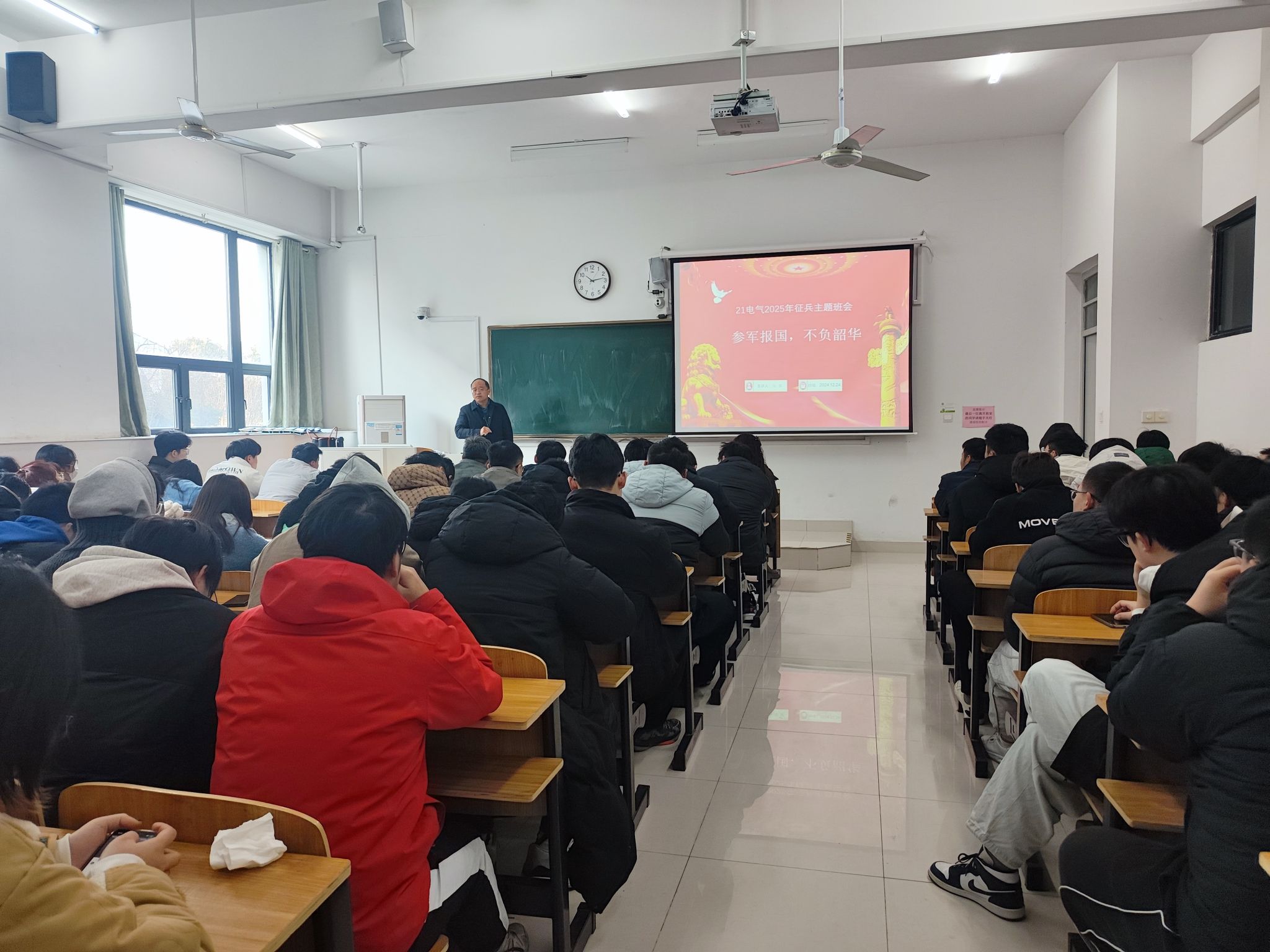 为积极响应国家号召,扎实推进大学生应征入伍工作,电气与电子工程学院毕业班辅导员于12月24日分专业开展了2025届毕业生征兵宣传主题班会。学院党委副书记、纪委书记尚磊出席各专业主题班会并发表动员讲话。