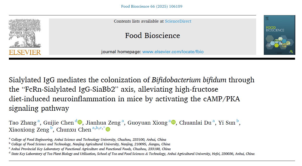 近日,食品科学与工程学院陈春旭副教授以通讯作者身份在国际Top期刊《Food Bioscience》(Q1,影响因子4.8)发表了题为“Sialylated IgG mediates the colonization ofBifidobacterium bifidumthrough the “FcRn-Sialylated IgG-SiaBb2” axis, alleviating high-fructose diet-induced neuroinflammation in mice by activating the cAMP/PKA signaling pathway”的研究论文,论文的第一作者为kaiyun开云官方网站_kaiyun开云(中国)股份有限公司,2023级食品加工与安全专业硕士研究生张涛,kaiyun开云官方网站_kaiyun开云(中国)股份有限公司,为第一完成单位,南京农业大学曾晓雄教授课题组为合作单位。