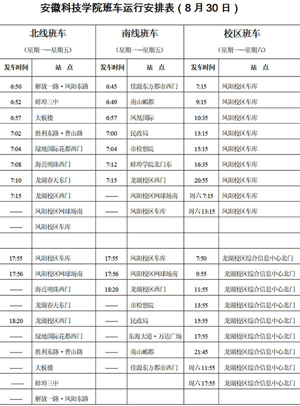 一、8月31日—9月4日,南、北线班车各站点按《班车运行安排表(8月30日)》(见附件)早上推迟15分钟发车,晚上提前15分钟发车;校区班车运行时间为:凤阳校区车库7:30、13:30,龙湖校区综合信息中心北门12:10、17:40。