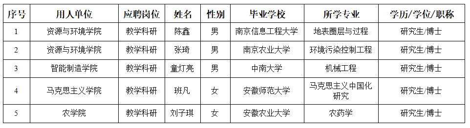 根据《安徽省事业单位公开招聘人员暂行办法》(皖人社发〔2010〕78号)、《关于进一步做好省属高校公开招聘工作的通知》(皖人社秘〔2018〕369号)以及相关文件精神,经考核,陈鑫等5位高层次人才符合我校2025年高层次人才拟聘用条件,现予以公示。