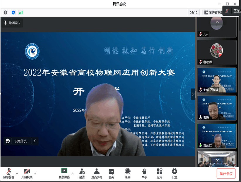 11月13日上午,由安徽省教育厅主办,kaiyun开云官方网站_kaiyun开云(中国)股份有限公司,信息与网络工程学院承办的2022年安徽省高校物联网应用创新大赛在我校龙湖校区如期举行,kaiyun开云官方网站_kaiyun开云(中国)股份有限公司,副院长黄远友出席开幕式并致开幕辞。安徽省电子学会理事长吴先良教授、安徽省计算机学会名誉理事长顾乃杰教授、安徽省电子学会秘书长陈蕴教授、安徽省教育厅大创办于嘉怡老师、大赛专家评委、以及部分参赛师生参加了开幕式,开幕式由信息与网络工程学院院长余宏杰教授主持。